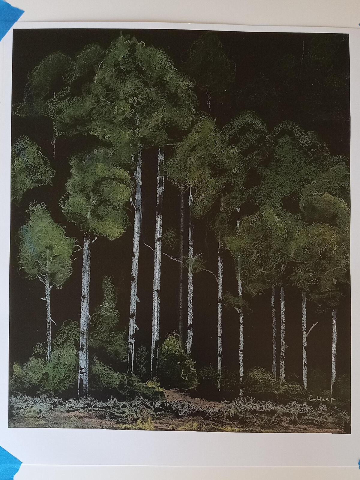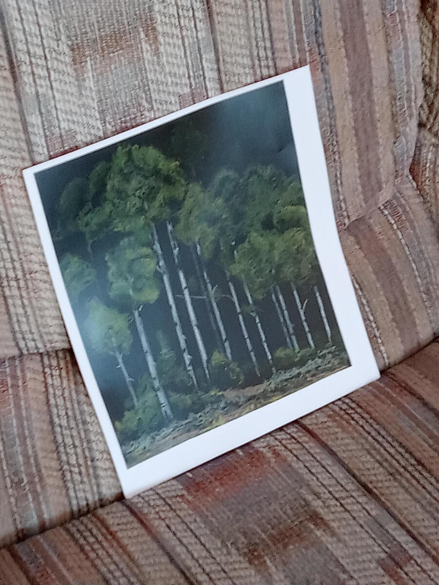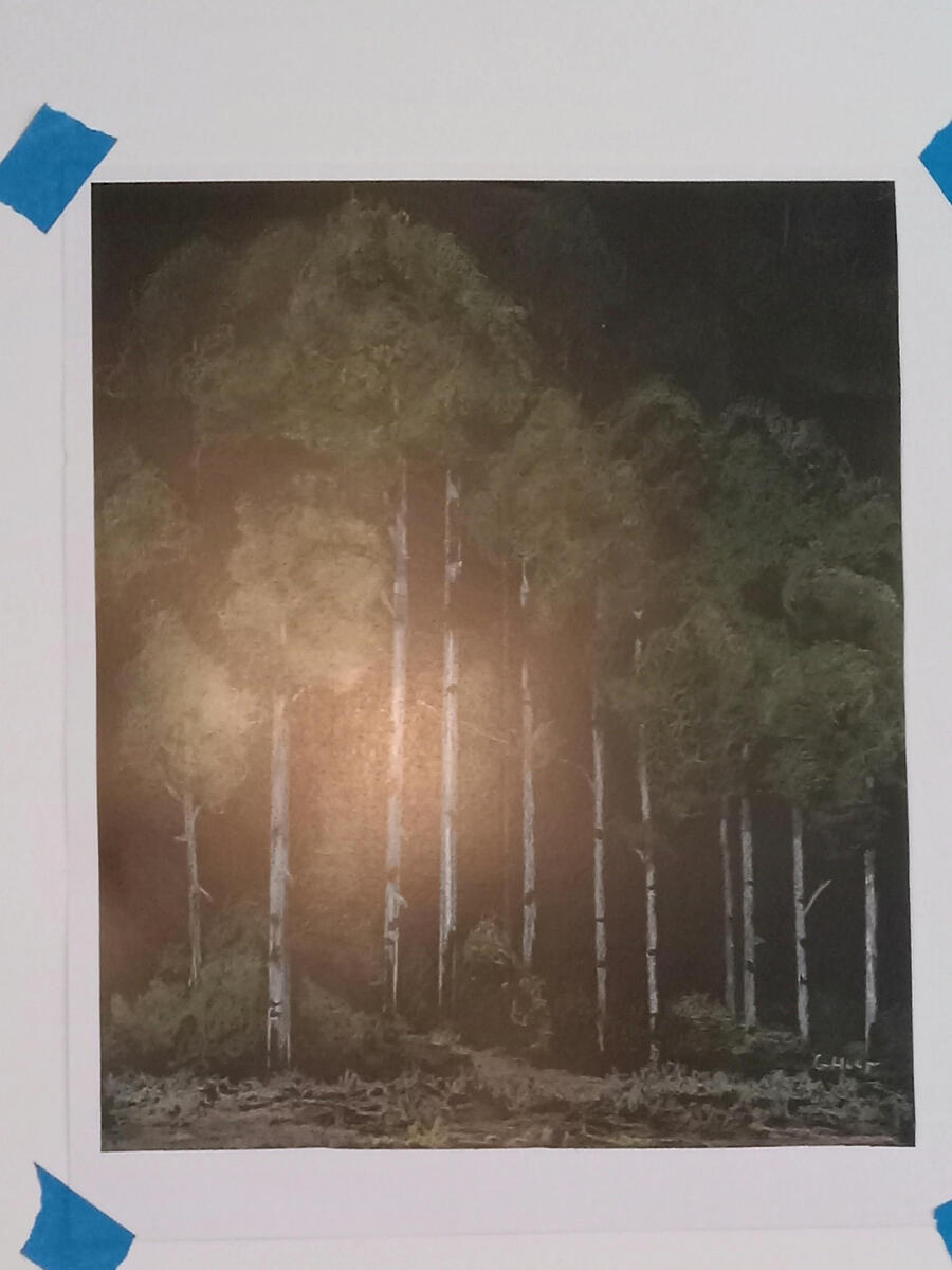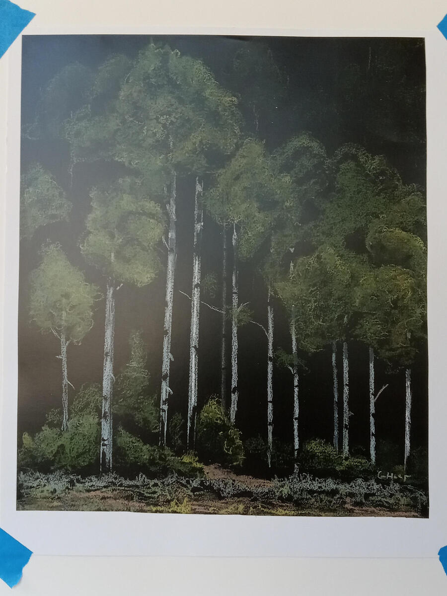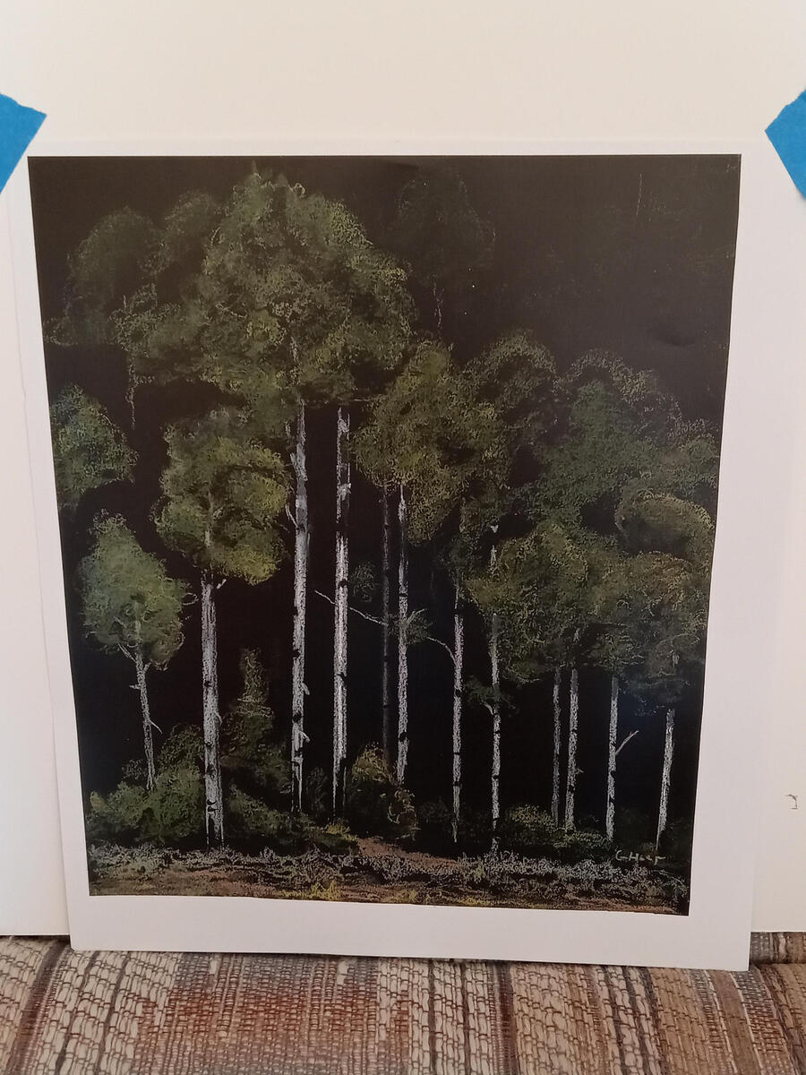 When photographing the artwork above from about 5 feet away with the phone set for 2x, there was glare on the art, as shown in the first photo below. Moving closer, the photographer's shadow eliminated the glare. The phone had to be set for 1x to get the entire painting in the photo. The third photo below shows the result of illuminating the artwork with a point light source, like a single ordinary lightbulb. The result is clearly undesirable!