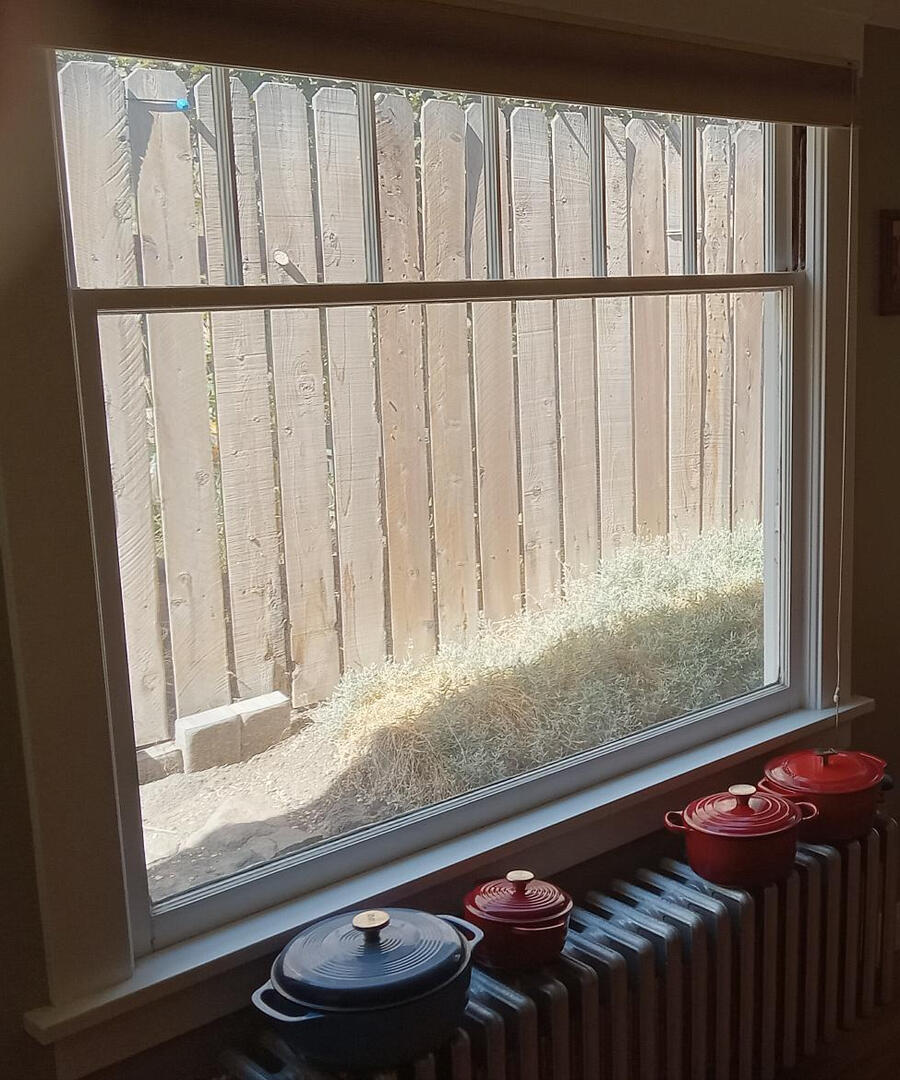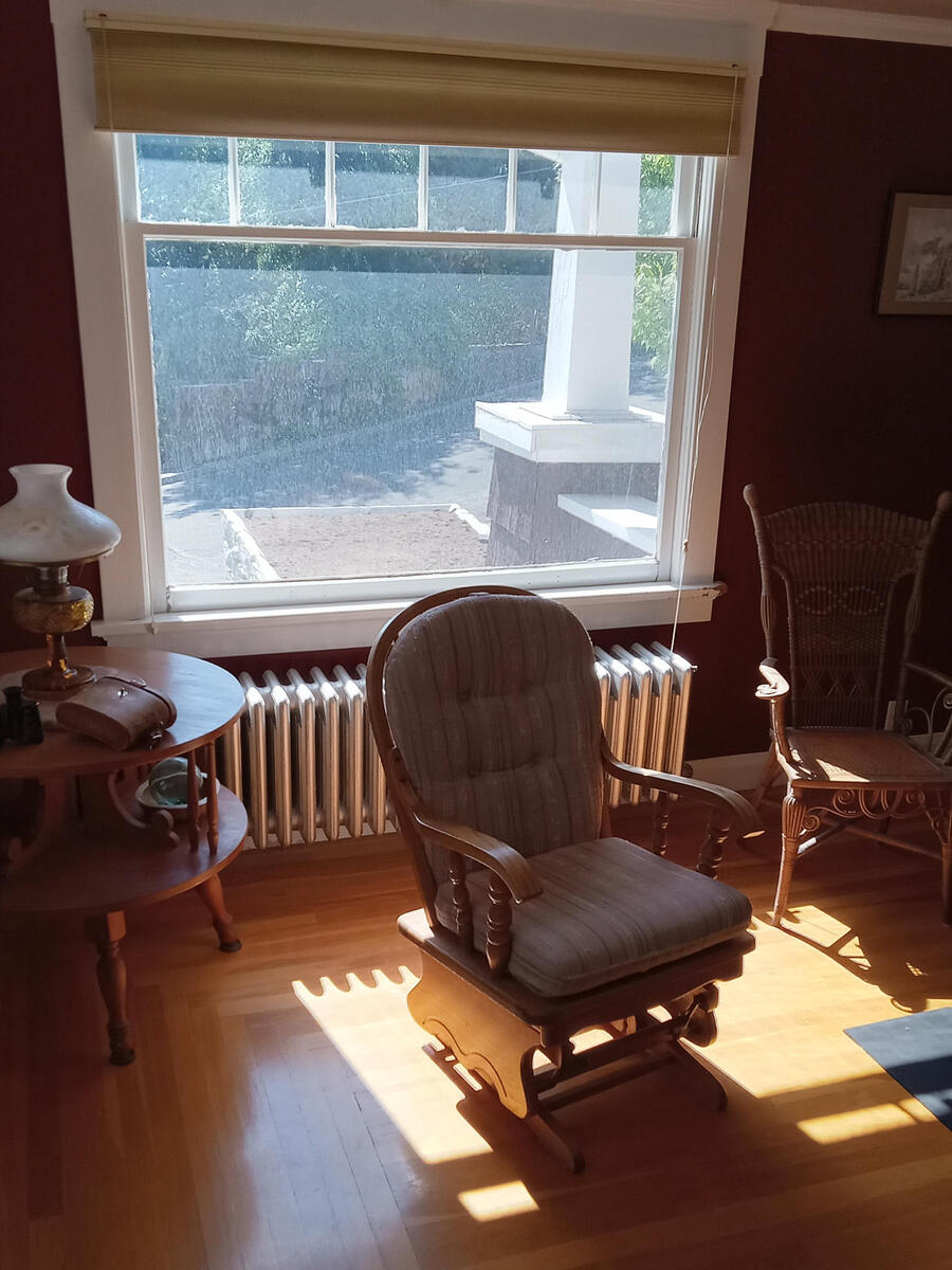 The first photo below shows bright light coming in a window - one would not want to photograph artwork in the bright, direct light. The second photo shows the illumination on the other side of the same room, much better not in the direct light! The third photo shows a different room, with light reflecting off a fence outside. Using the reflected light to illuminate the artwork being photographed is a good strategy.