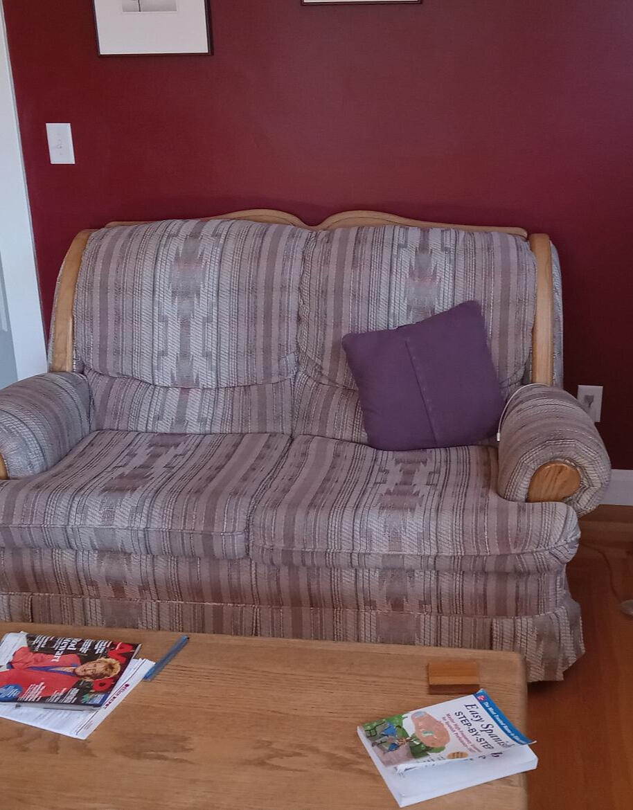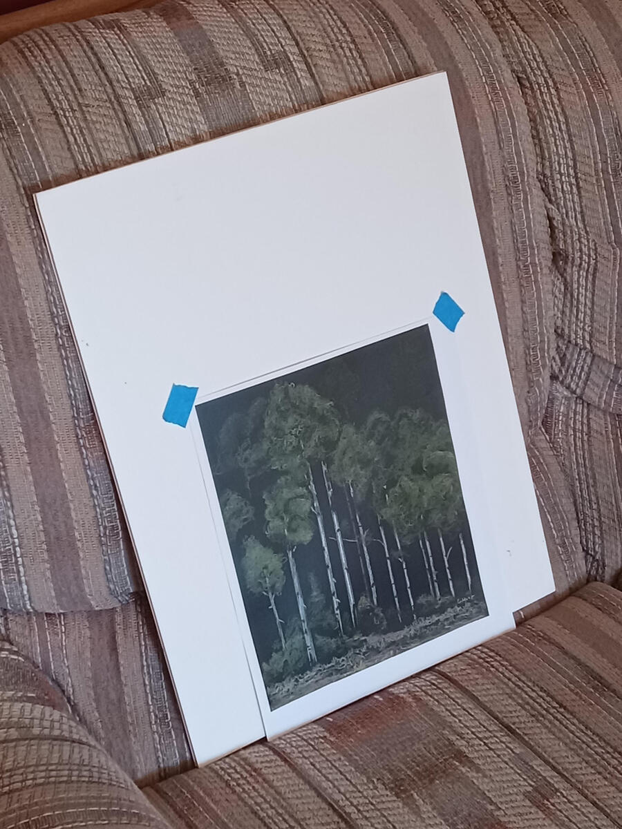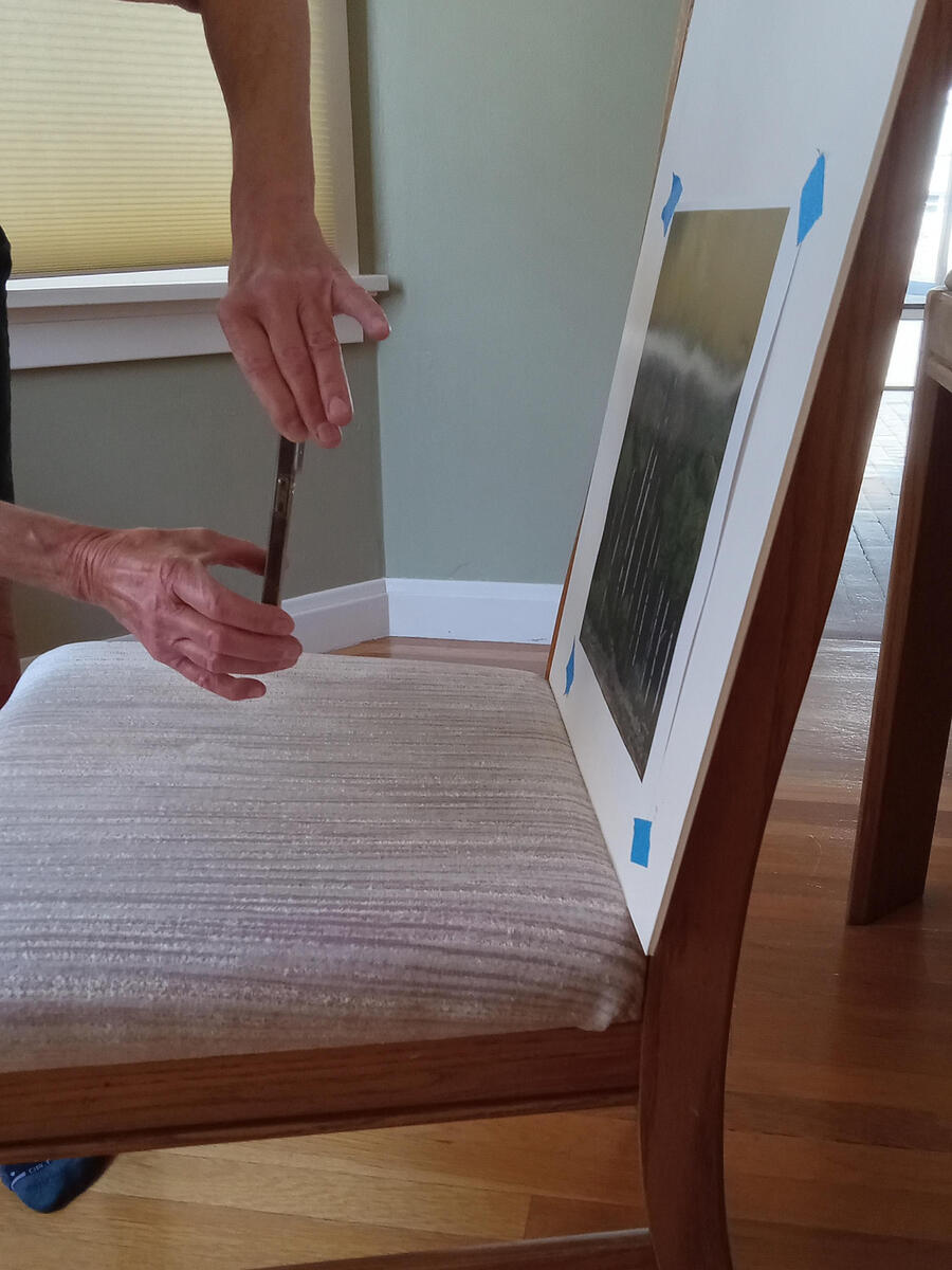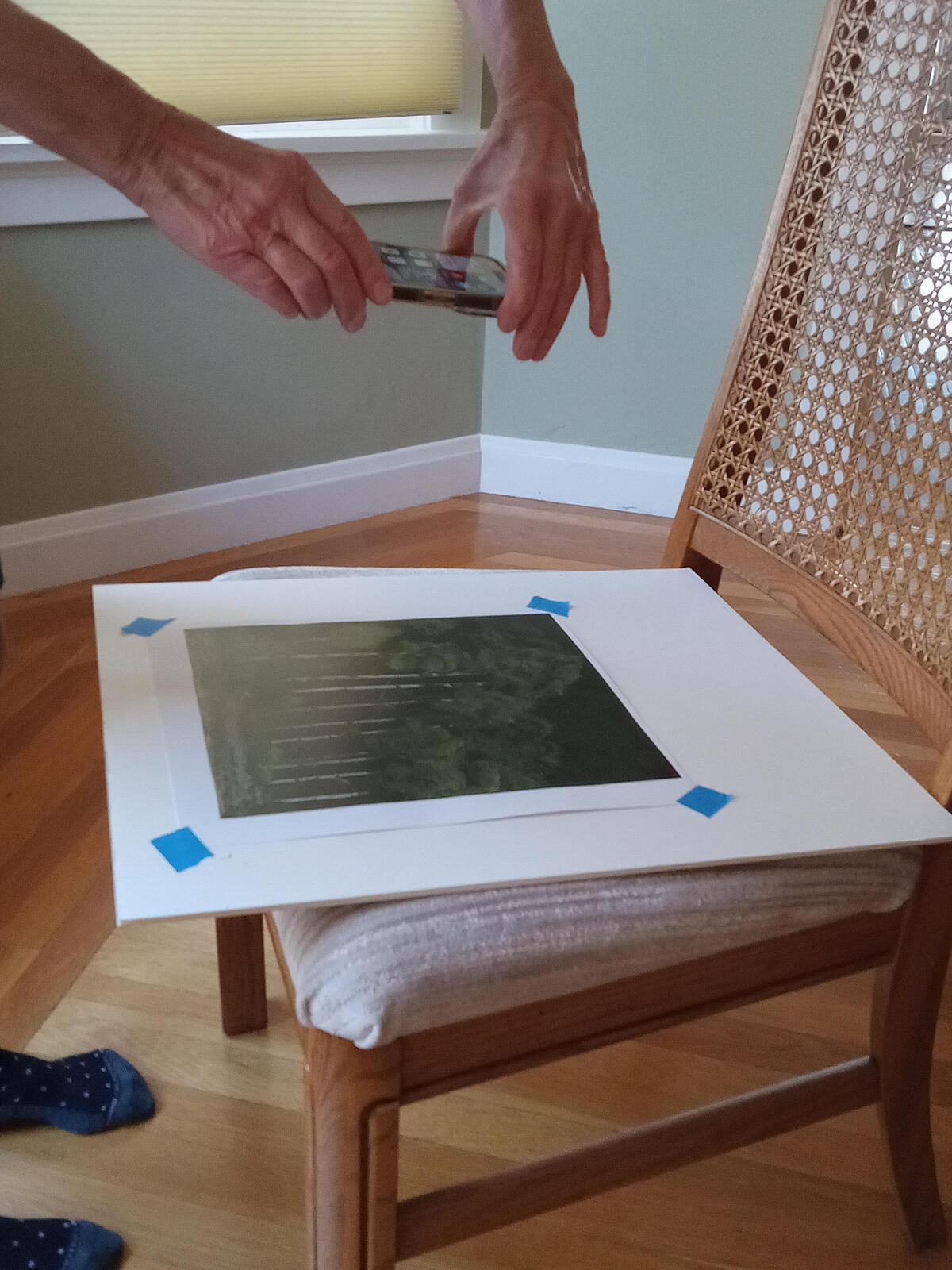 The photos below show artwork to be photographed. The first picture shows the artwork leaned on the back of the sofa in the second photo above. The artwork alone is too flimsy, causing it to not lie flat. In the second photo, a piece of backing board provides some support, but the artwork does not lie flat against it. The third photo shows some blue painter's tape used to hold the artwork fairly flat, the preferred choice!